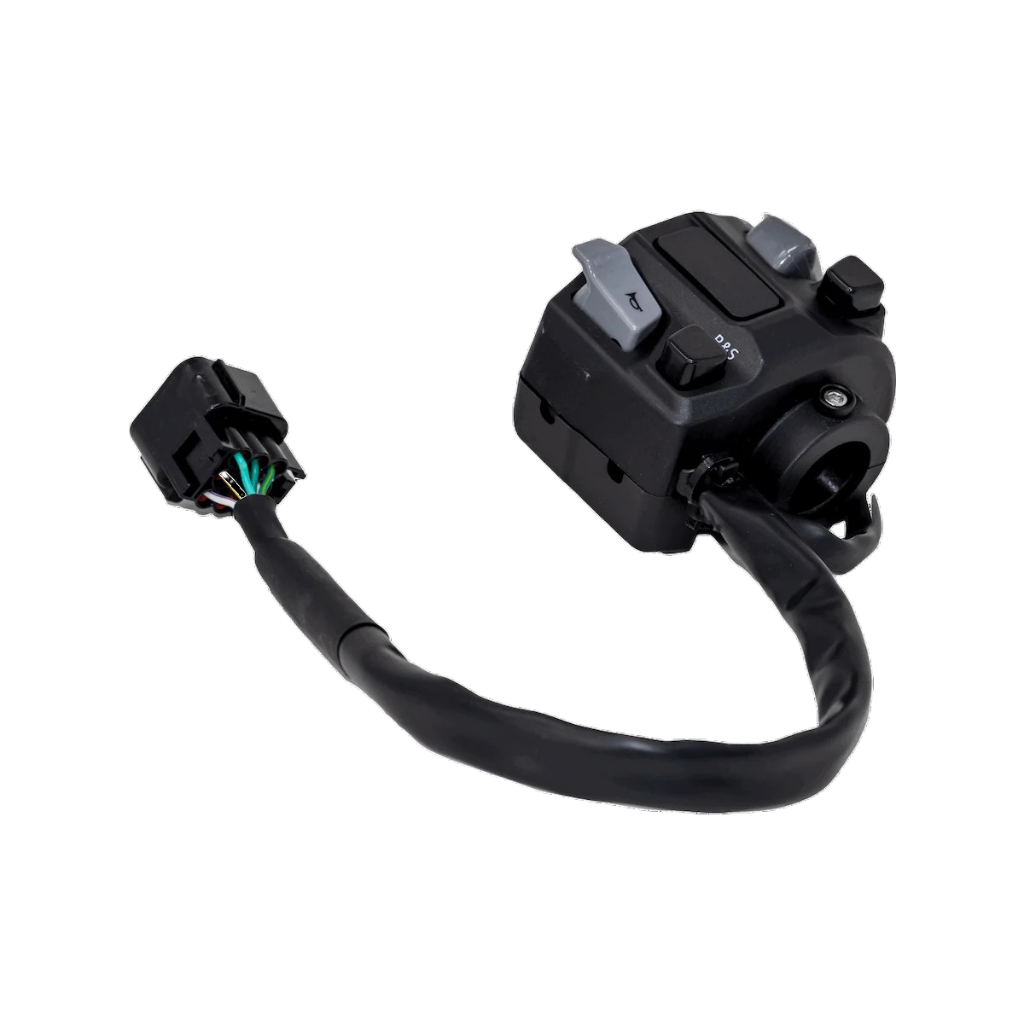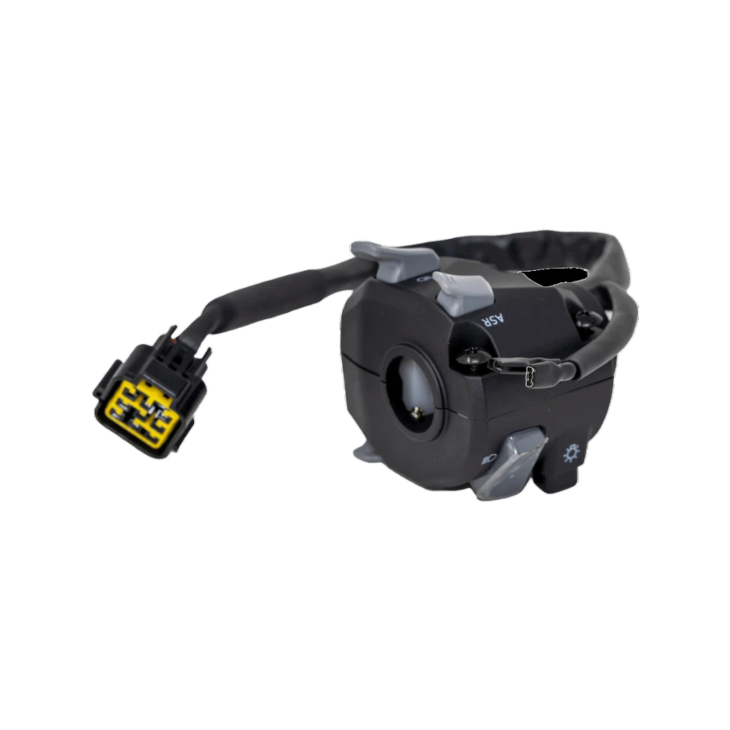 Serienmäßige linke Multifunktions-Bedieneinheit mit Fernlicht, Scheinwerfersteuerung, ASR-Antriebssteuerung, Hupe, Rückwärtsgangwahlschalter und Ausschalter.