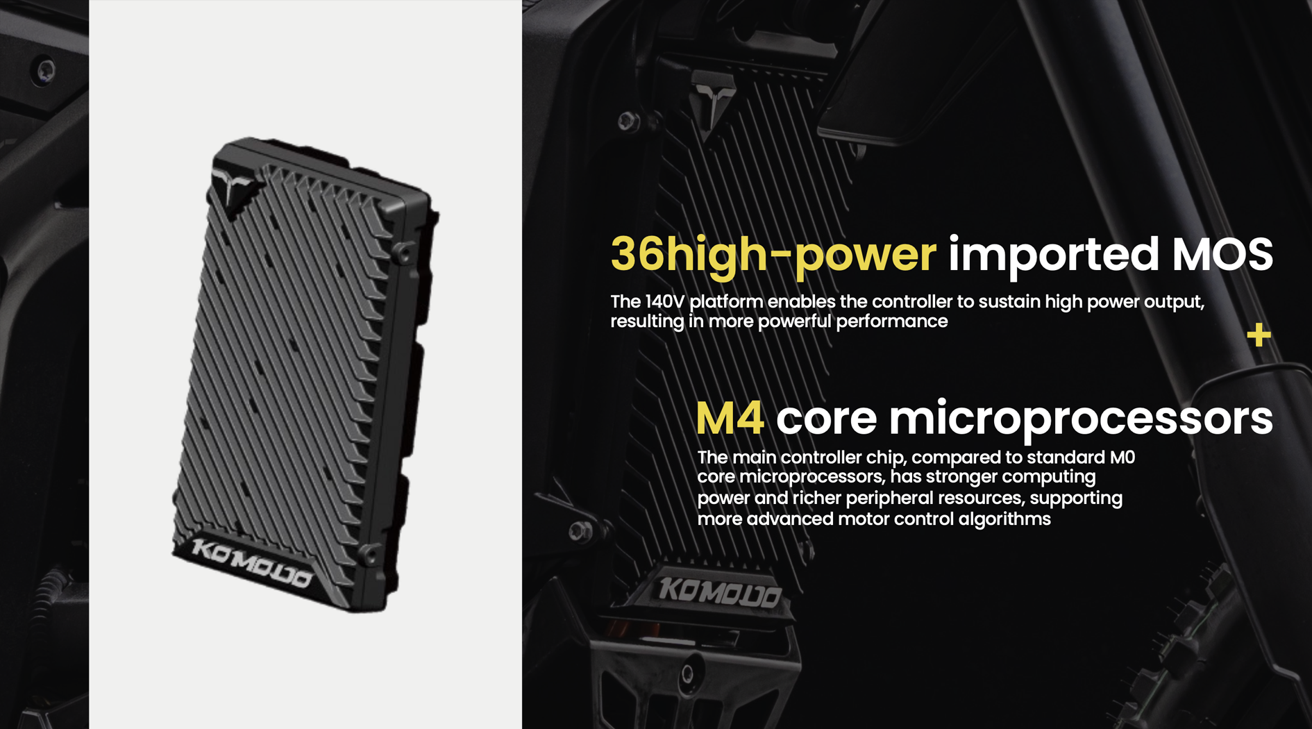Der neue 72V Antrieb mit integriertem High-Performance Controller sorgt für sofortige Gasannahme und nahtlose Leistung in allen Fahrsituationen. Mit einer Spitzengeschwindigkeit von 105 km/h ist die Komodo bereit für jedes Gelände – von Trails bis zur Strecke.