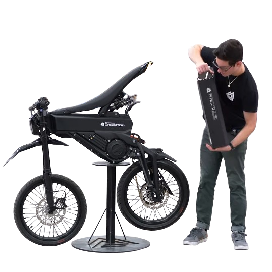 Der Talaria XXX Rahmen ist faltbar , somit kannst du den Akku herausnehmen oder das Bike ohne Rad besser transportieren.